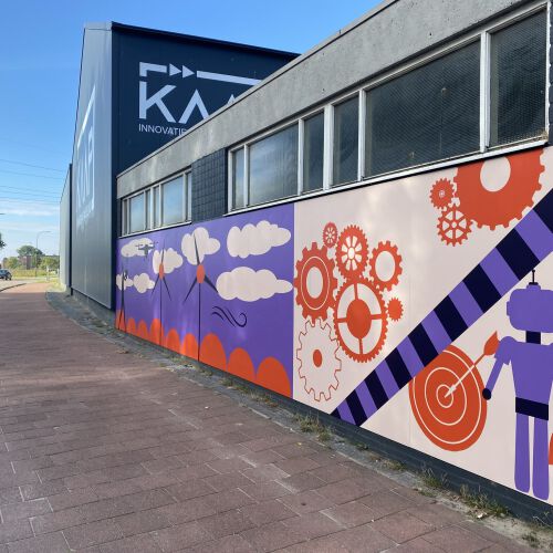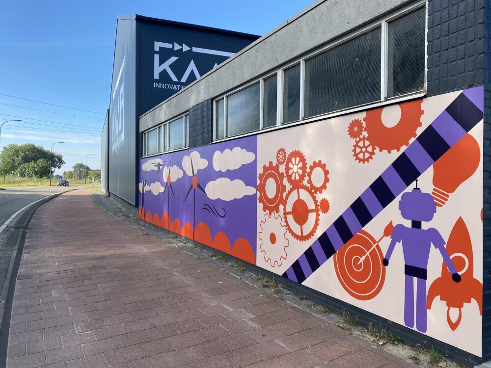 Wanneer u de Vlissingse Kenniswerf binnenrijdt, wordt u verrast door een kleurrijk ontwerp op de muur van de KAAP. Een student van Scalda heeft de gebeurtenissen in de KAAP vertaald naar een beeld voor buiten. Zo krijgt u een idee wat er zich afspeelt op deze unieke ontwikkel-, test- en demolocatie in Vlissingen!